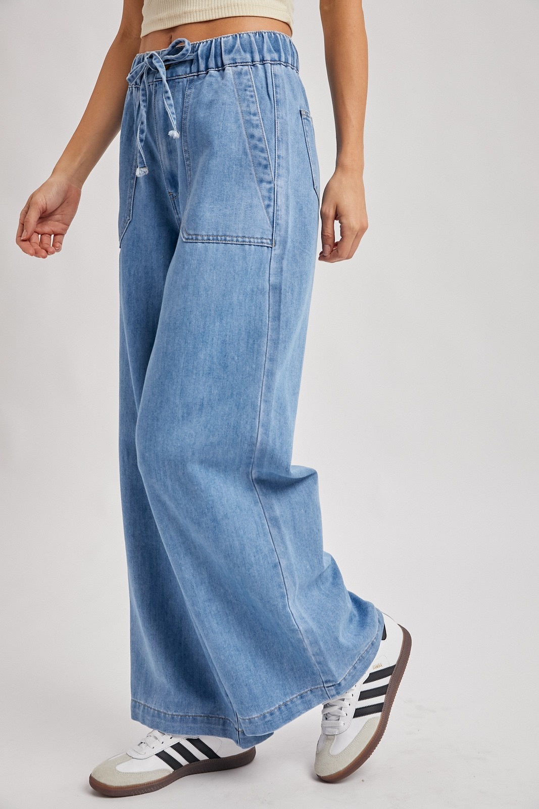 TALL GIRLS UNITE WITH THESE JEANS!!!! Effortlessly blending the comfort of lounge pants with the timeless style of denim, wide-leg jeans are a modern wardrobe essential. They feature a supremely comfortable high-rise paperbag waist with both elastic gathering and an adjustable drawstring for a perfect, personalized fit. The flowing, wide-leg silhouette creates a relaxed and on-trend look, while large front patch pockets add a touch of utilitarian chic. Crafted from a soft denim fabric, these pants are the ultimate choice for a stylish yet laid-back day, offering both freedom of movement and a fashion-forward statement.
