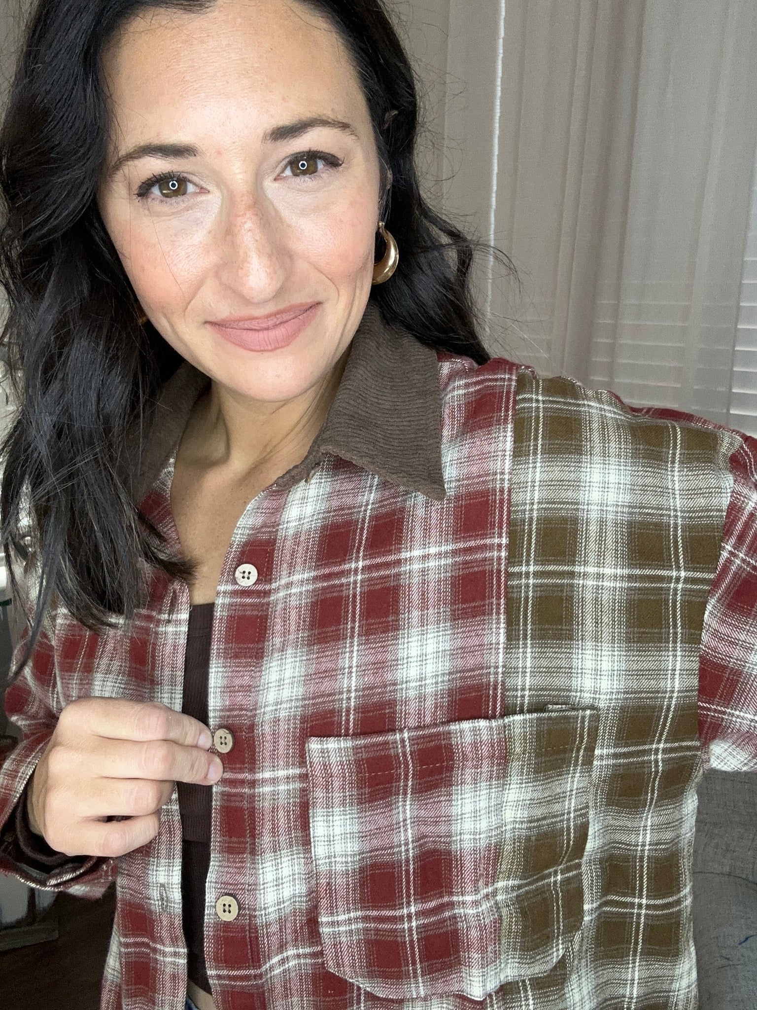 Step into fall in effortless style with our Cozy Harvest Plaid Flannel. This button-up features a warm mix of rustic red and olive plaid tones, creating that perfect lived-in look. The relaxed fit and soft, lightweight fabric make it ideal for layering over your favorite basics. Finished with a chest pocket, corduroy collar, and subtle high-low hem, it’s the go-to piece for everything from pumpkin patch days to casual coffee runs.