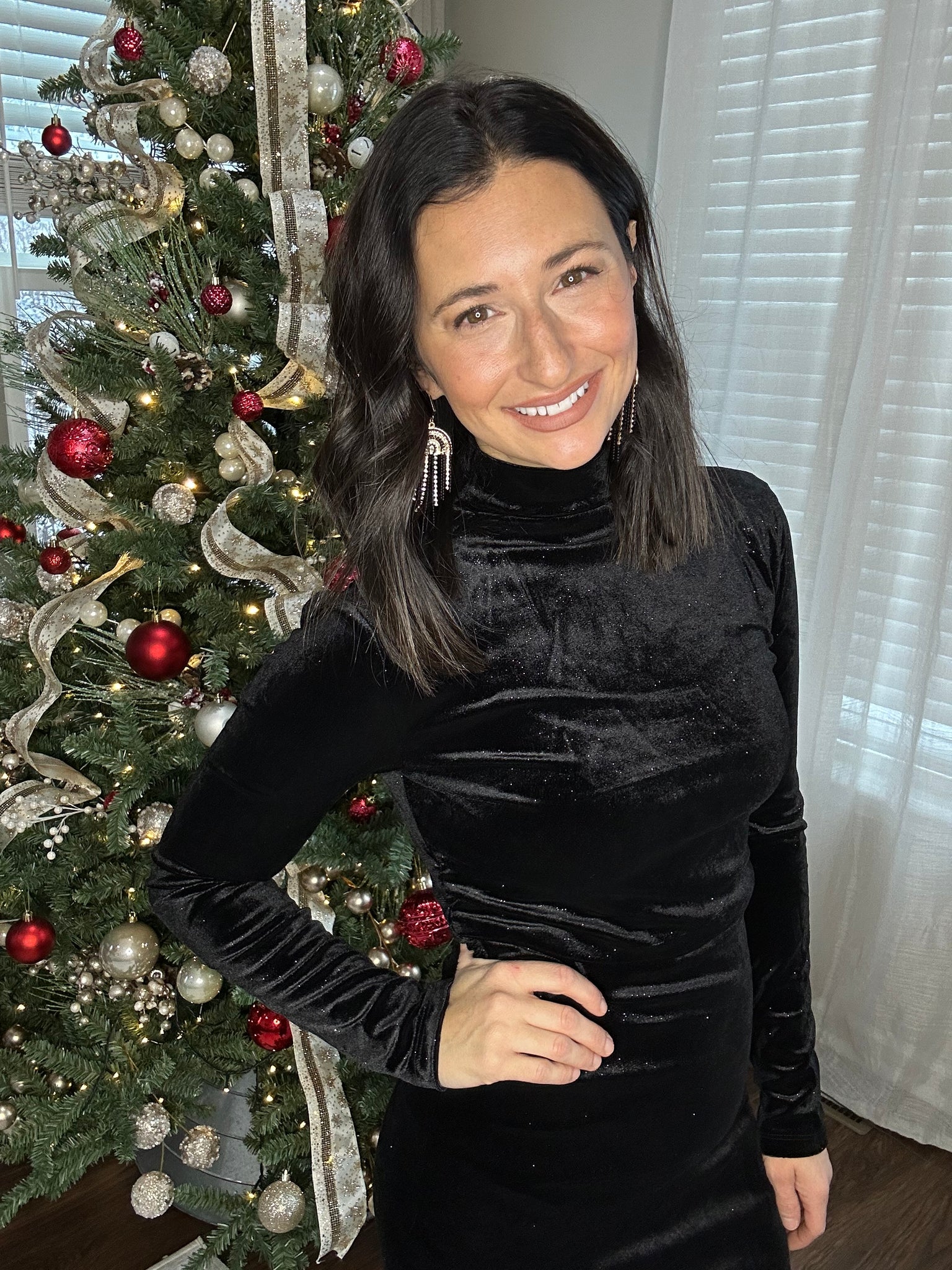 Step into holiday glamour with this high-neck, glitter velvet midi dress. Crafted from luxuriously soft velvet with a subtle shimmer, it features elegant shirring that flatters the figure while adding a touch of sophisticated texture. The long silhouette and high neckline create a chic, refined look, perfect for holiday parties, New Year’s Eve celebrations, or any special occasion where you want to shine. Pair with heels and statement earrings for an effortlessly festive ensemble.
