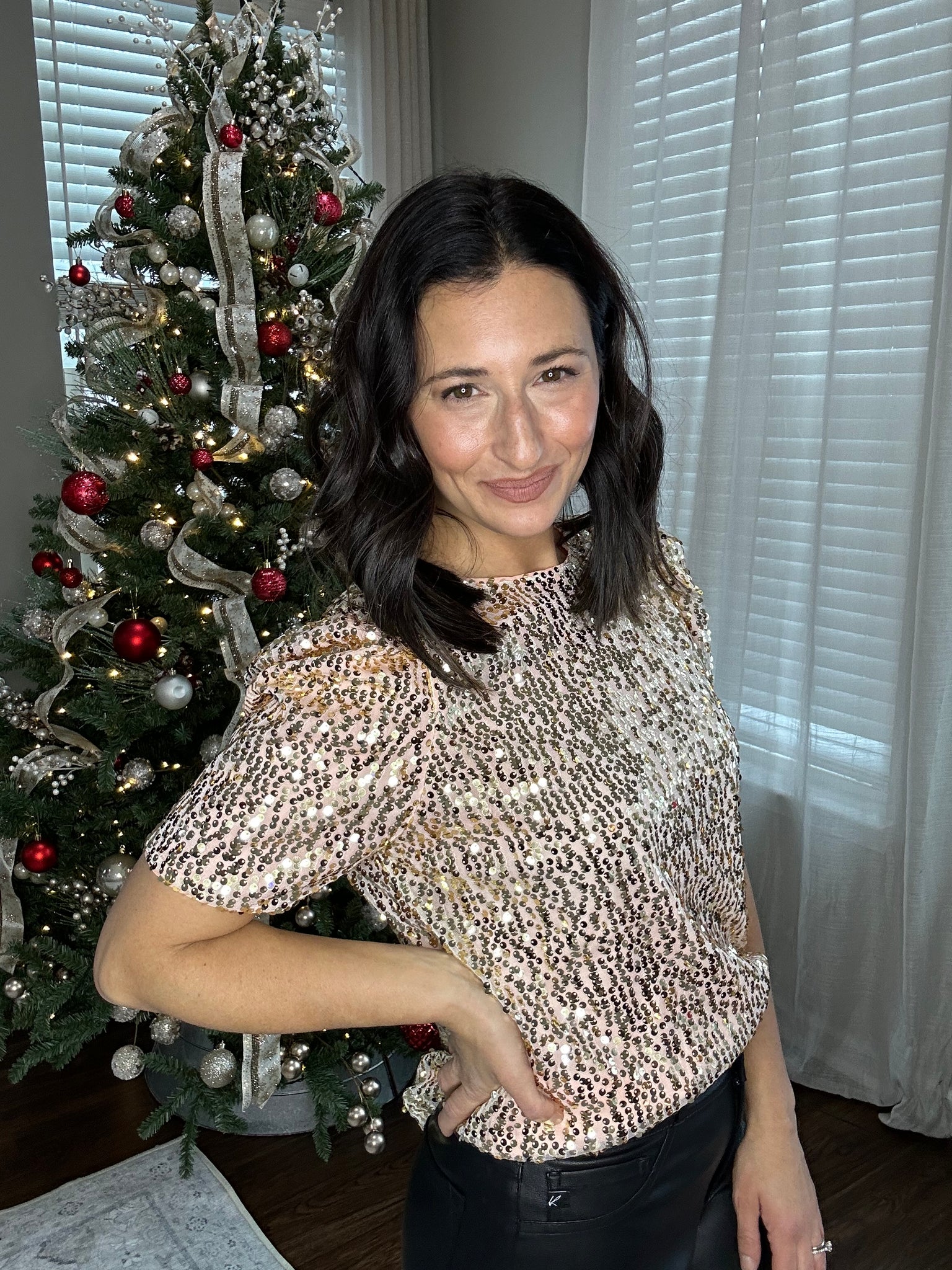 Step into the season with effortless sparkle in this round-neck sequin top, designed to shine from every angle. The chic puff shoulders and 1/2 sleeves add a touch of modern elegance, while the fully lined interior keeps it comfortable for all-night wear. A subtle keyhole with a button closure at the back gives it the perfect finishing detail. Pair it with denim for a fun night out or dress it up for any festive event — this top brings instant glam to any look.