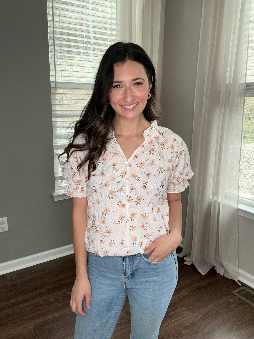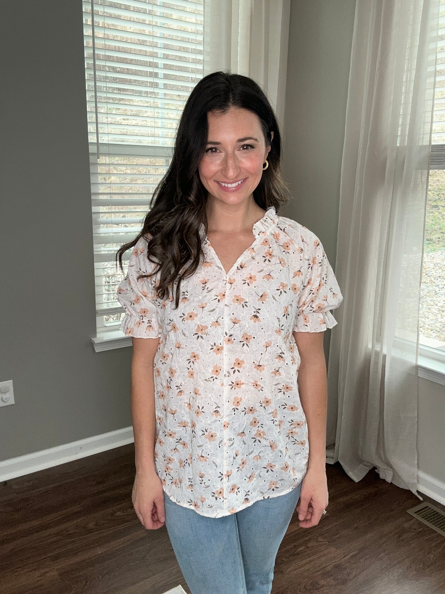 Embrace bohemian chic with our Celia blouse, featuring intricate eyelet details that add a touch of elegance to your outfit. The charming floral print on this blouse brings a whimsical and feminine flair to your look, perfect for both casual outings and special occasions. Stand out with the unique puff sleeves that create a fashionable statement, while the frill accents add a playful and stylish dimension to the top. The neutral color of this blouse offers versatility, allowing you to easily mix and match with different bottoms and accessories for various trendy ensembles.
