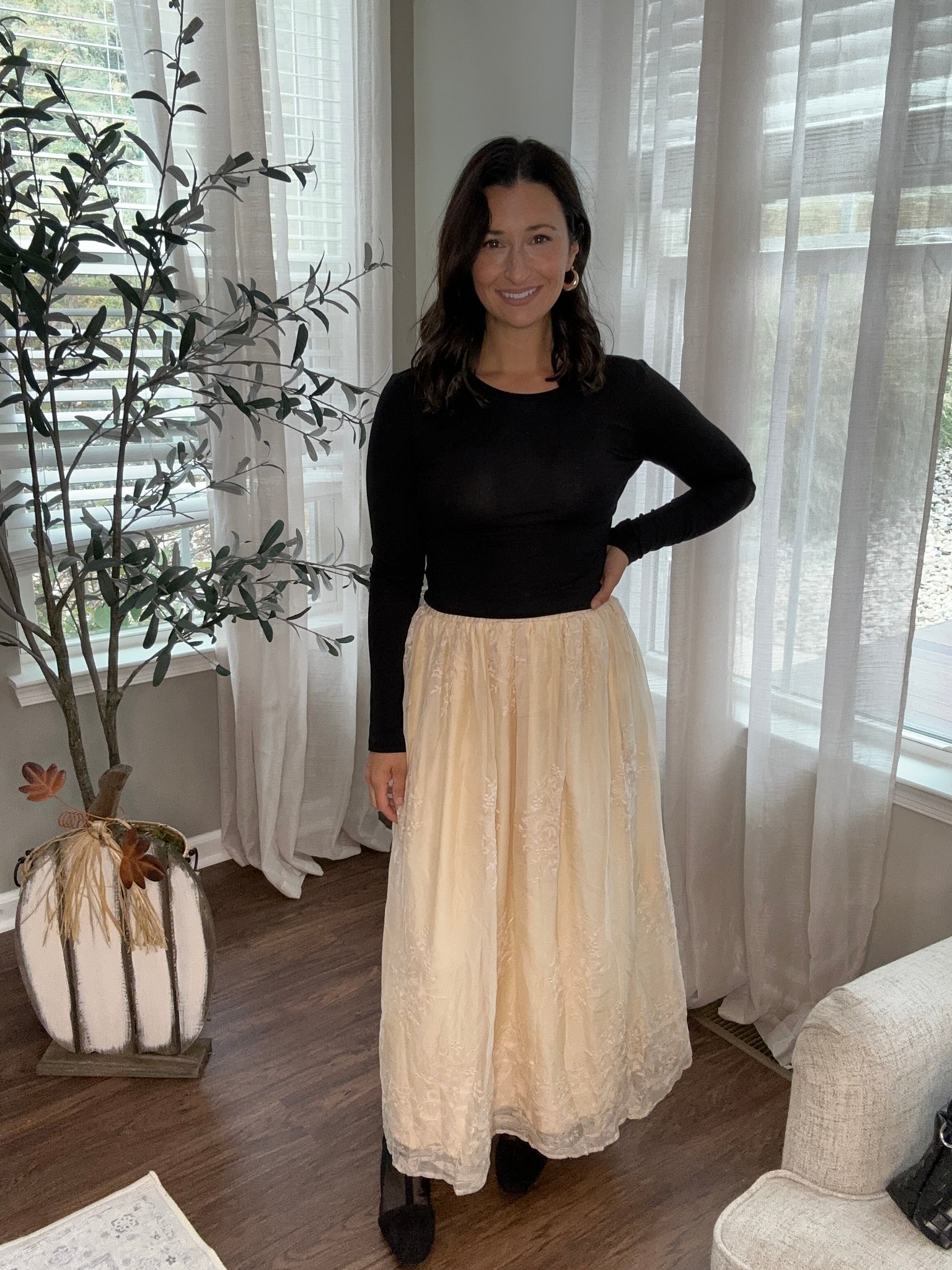 Romantic, timeless, and effortlessly elegant — our Floral Lace Maxi Skirt brings a touch of femininity to every outfit. The delicate embroidered detailing adds a graceful charm, while the soft mesh overlay flows beautifully with each step for a look that’s both dreamy and refined.