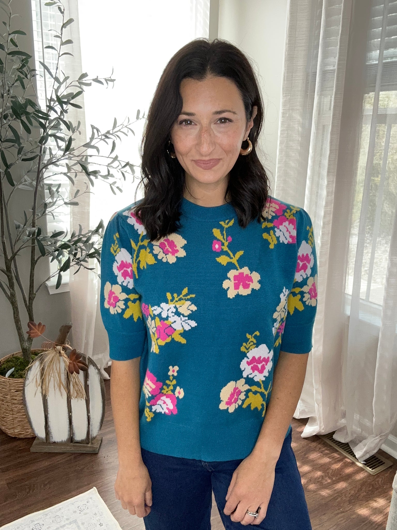 Add a playful, bohemian touch to your wardrobe with our Vibrant Mood Floral Sweater. Featuring a charming floral design, this top brings vibrant color and whimsical style to any outfit. The puff short sleeves create a trendy silhouette that’s both flattering and comfortable, perfect for casual outings or dressing up for special occasions.