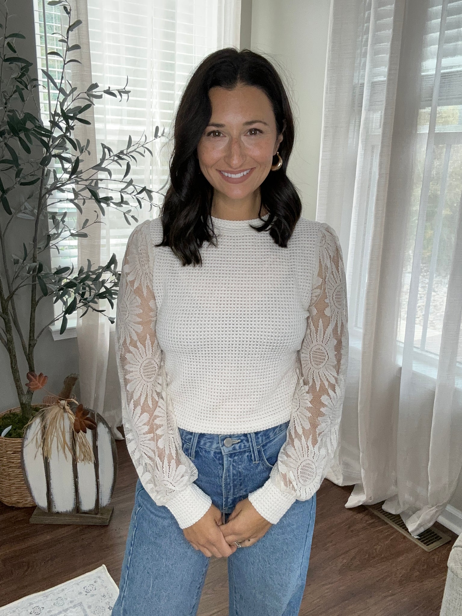 Elegant and textured, this waffle knit top is a stunning blend of cozy and chic. The delicate sunflower mesh bubble sleeves add a graceful, feminine charm, while the patchwork knit design brings a modern twist. Perfect for dressing up or down, this versatile piece pairs beautifully with jeans, skirts, or tailored pants for an effortlessly stylish look.